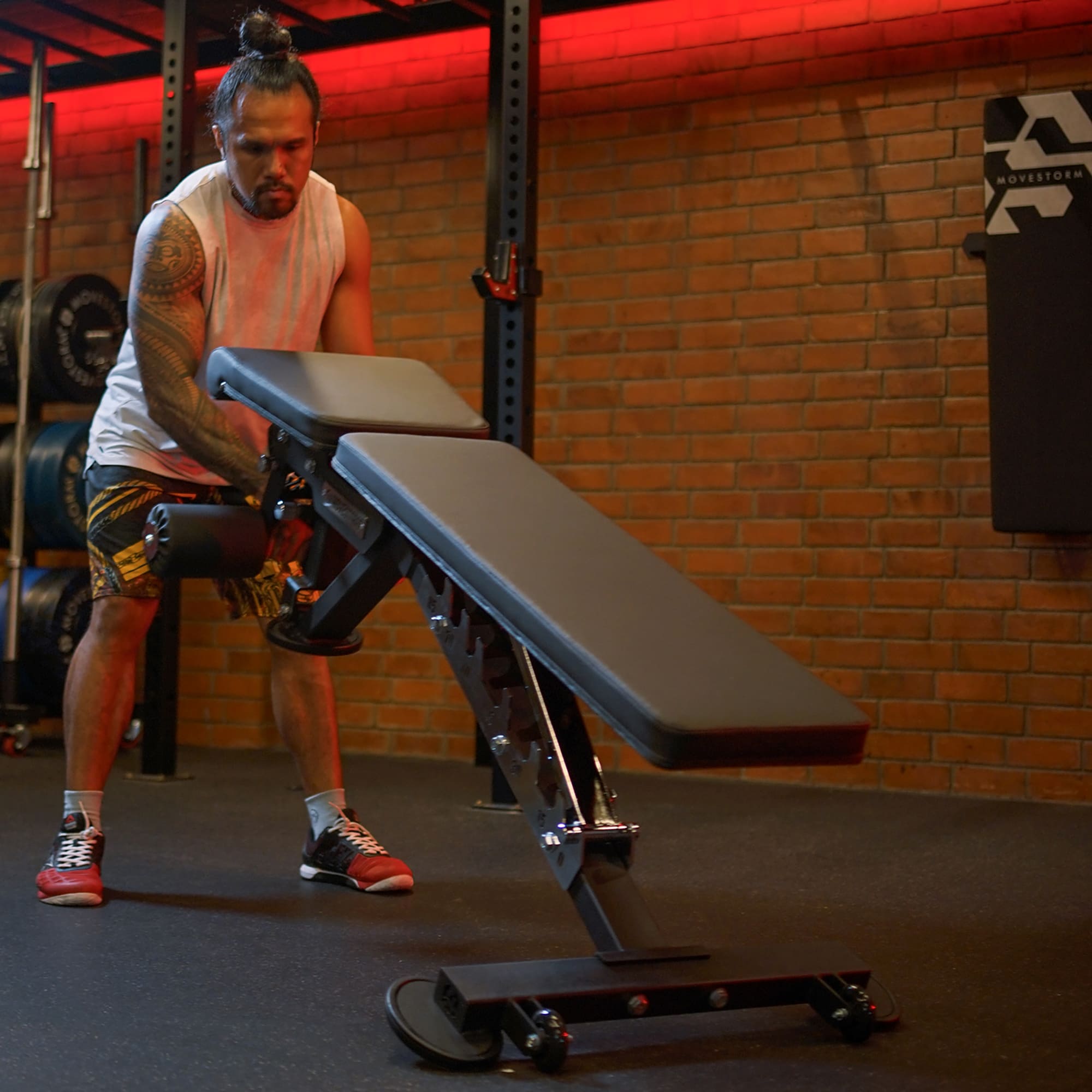 Because of its compact footprint, the Movestorm Adjustable Bench OG 2.0 fits perfectly into any training space — from garage gyms to pro facilities. With its transport wheels and handle, moving it around your gym setup is effortless. Furthermore, the ladder-style back adjustment ensures fast angle changes, supporting a wide range of exercises for full-body training versatility.