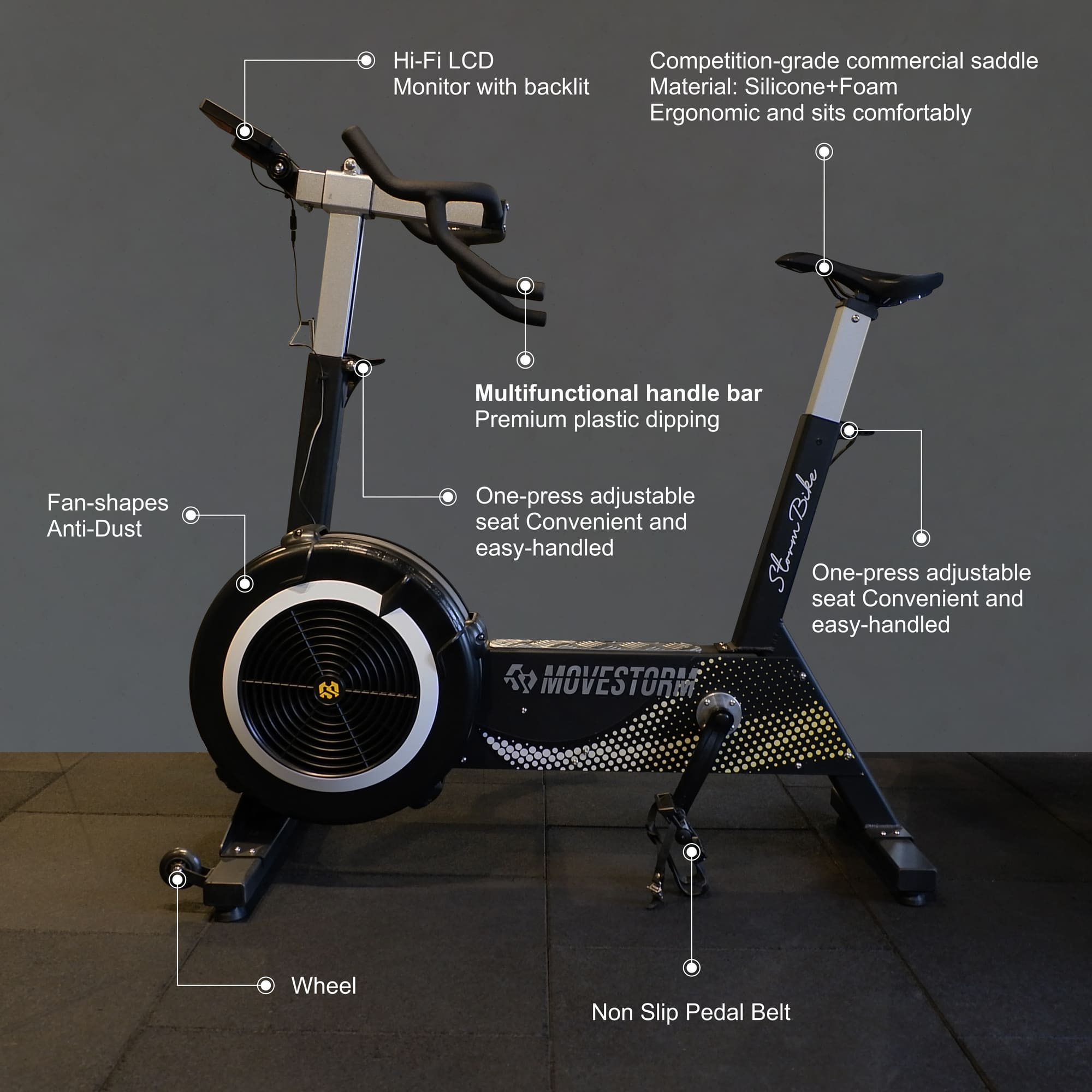 The Movestorm Stormbike brings a natural and responsive cycling feel into your home. Its air-resistance system increases intensity as you pedal faster, giving you a ride that closely matches the sensation of outdoor cycling. This makes the Stormbike suitable for warm-ups, interval sessions, endurance rides, and daily cardio routines.